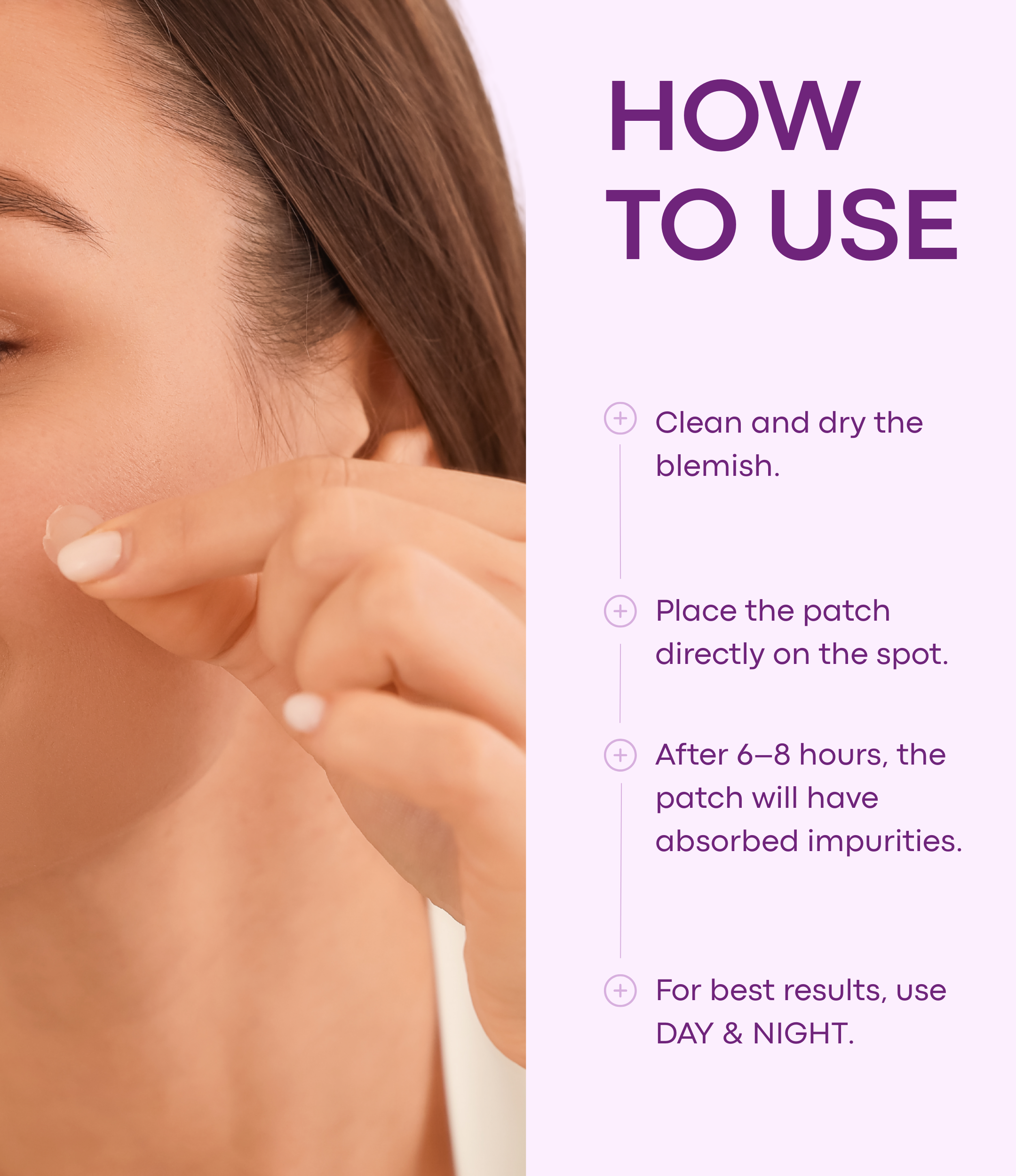 Clean and dry the blemish, then place the patch directly on the spot. After 6–8 hours, the patch will have absorbed impurities and can be removed.